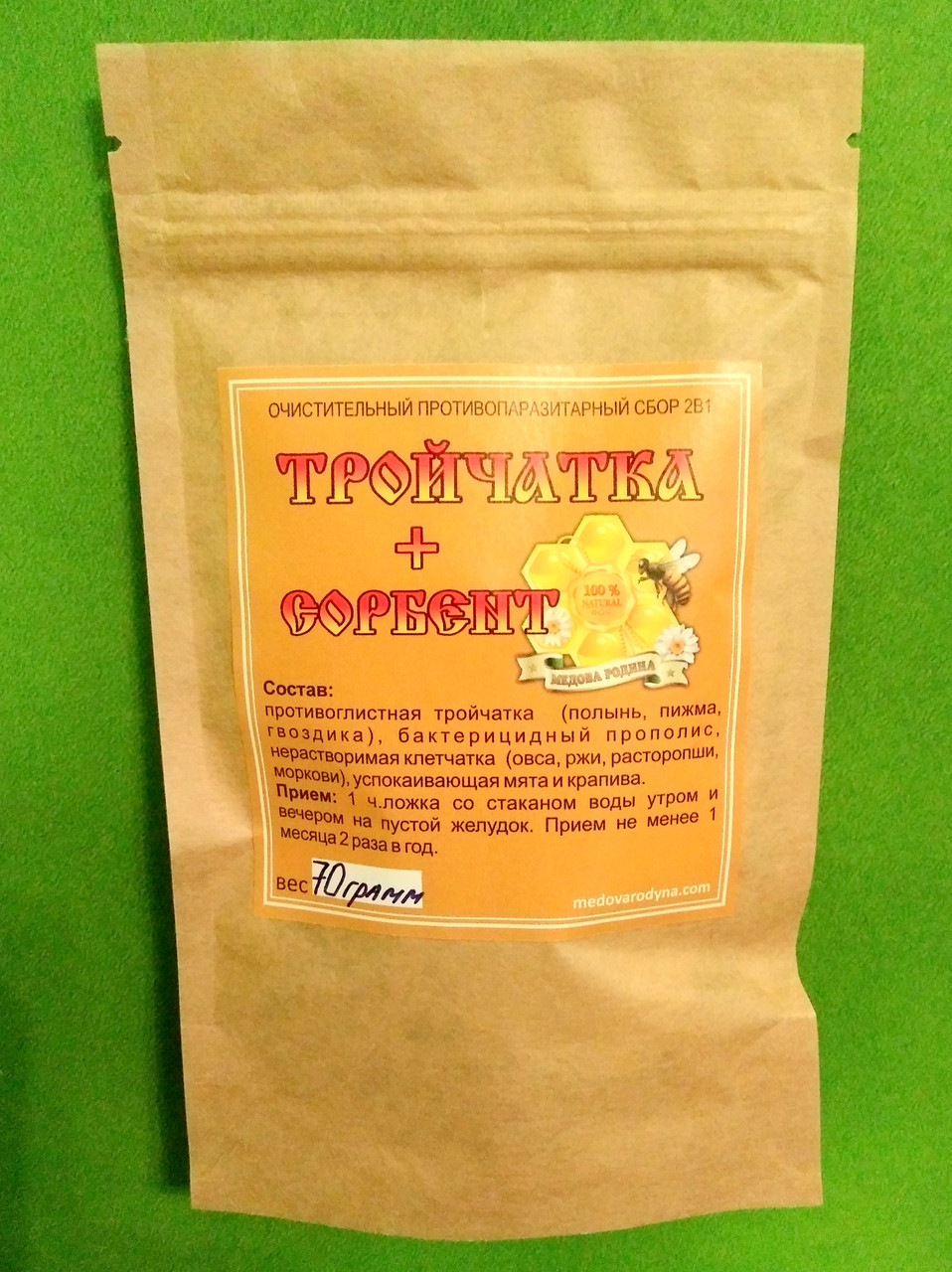 Трійчатка являє собою збирання антипаразитарної трави: піжми, полину та гвоздики, які разом підсилюють дію один одного. І з успіхом використовуються для знищення круглих, стрічкових і плоских черв'яків на всіх стадіях їх розвитку.